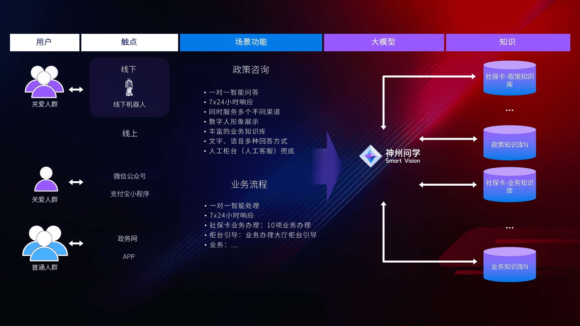 • 利用大语言模型+RAG技术,,,,支持多轮对话,,,可识别多种同义词、、近义词,,,精准理解关爱人群语义快速输出结果。。。。