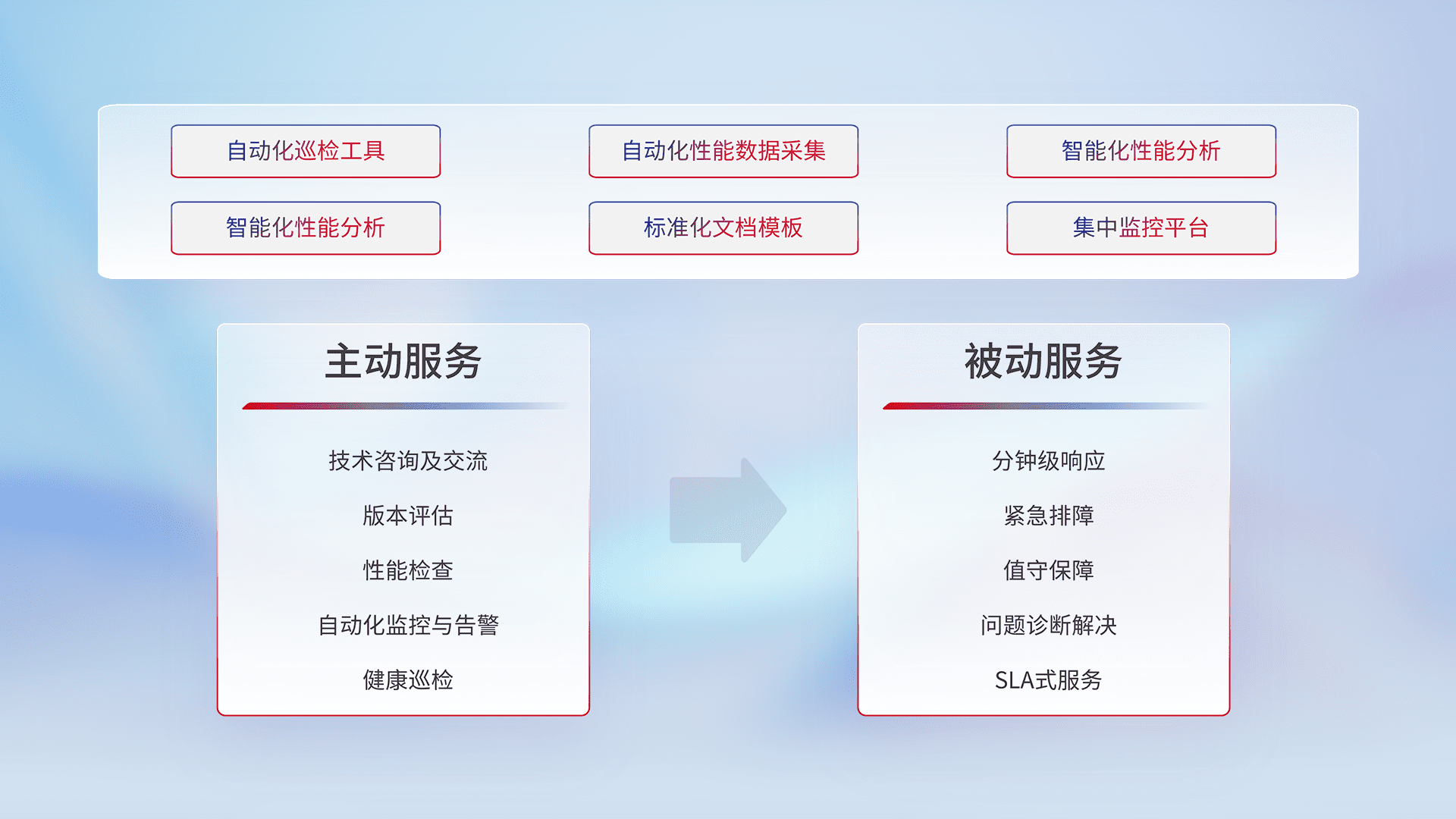 智能化工具和标准化文档,,保障服务质量,,,,提供主动服务(包含技术咨询、、、版本评估、、性能检查、、、自动化监控与告警、、、、健康巡检)和被动服务包含(分钟级响应、、、、紧急排障、、、值守保障、、、问题诊断解决、、SLA服务)。。。