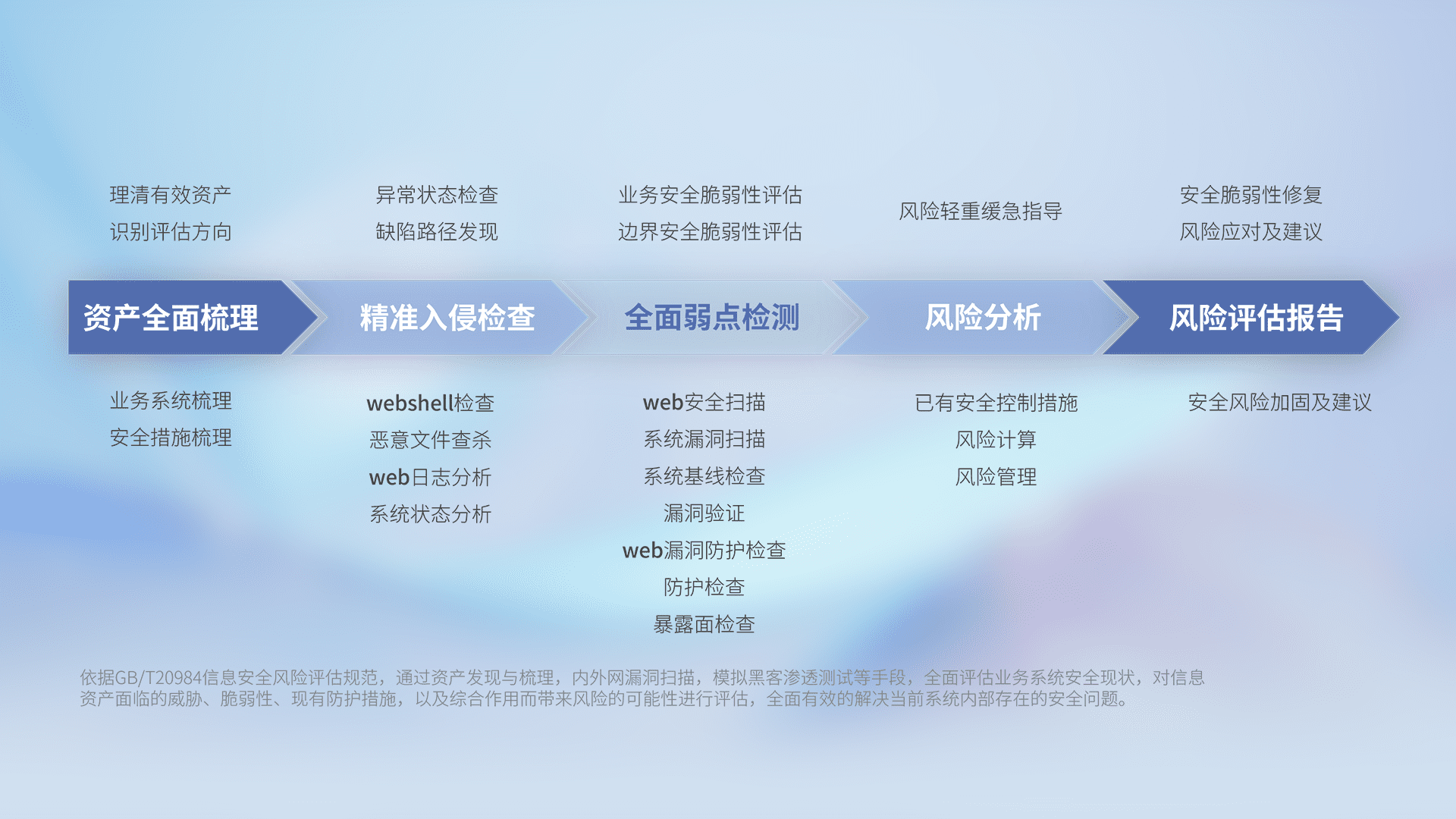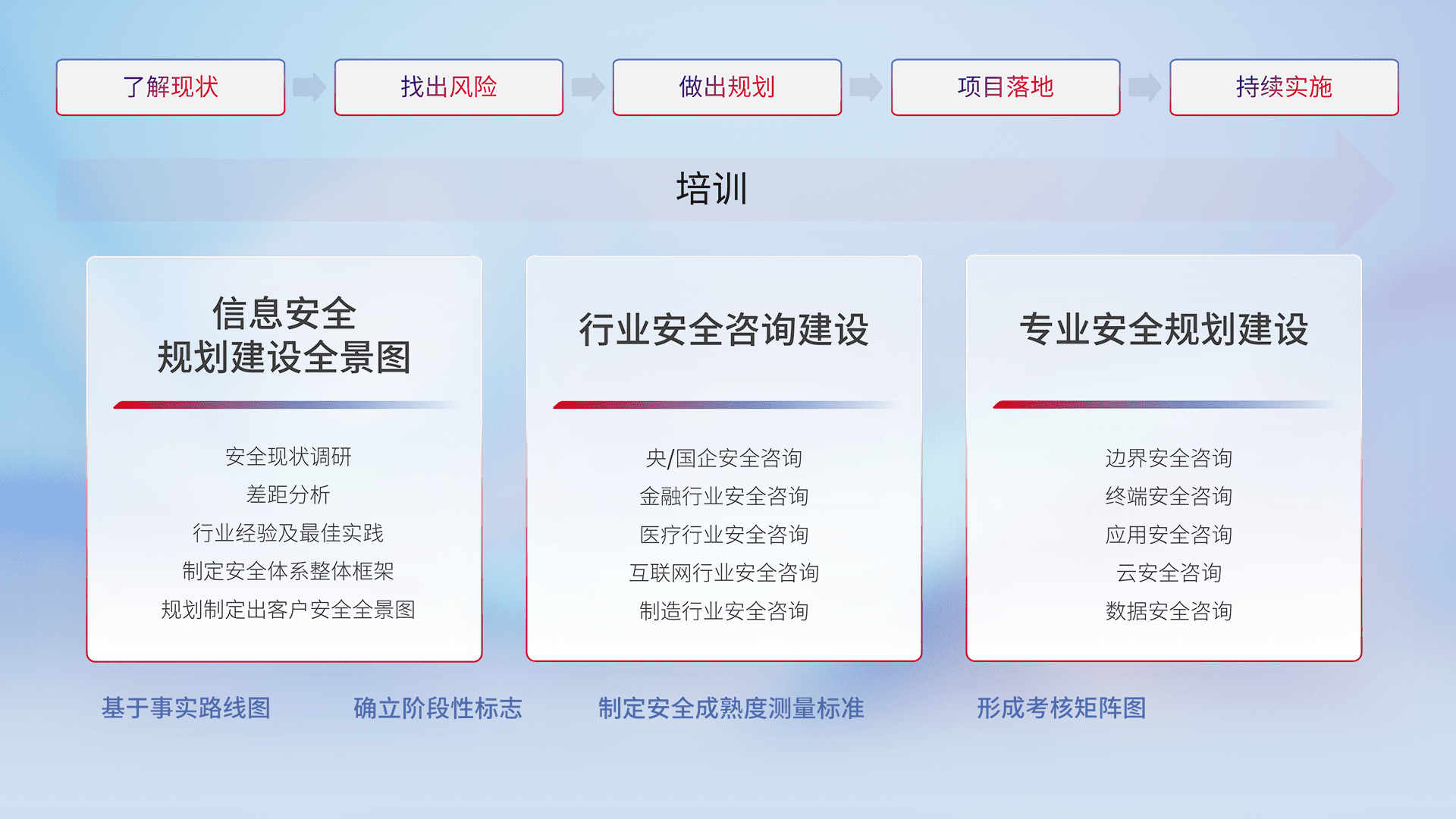 针对客户行业特性,,,,以专业的安全服务+多厂商联合解决方案提供专属的一站式安全管理服务,,,,帮助客户全面感知网络空间威胁,,基于识别、、、、检测、、分析、、、防护、、监测、、、响应的服务理论模型,,,从方案咨询、、集成交付、、、、评估验证、、、优化加固、、、运维运营,,,致力于为客户提供完整的闭环管理式安全服务。。以实战经验为客户打造高抵御风险的安全体系,,帮助客户发现威胁、、对抗威胁、、、处置威胁,,,不断积累安全对抗能力,,持续保障数字化安全。。。